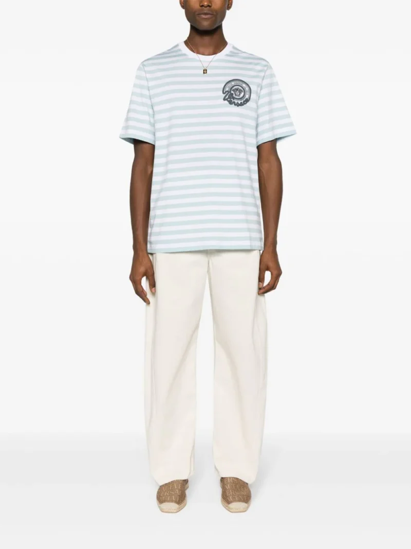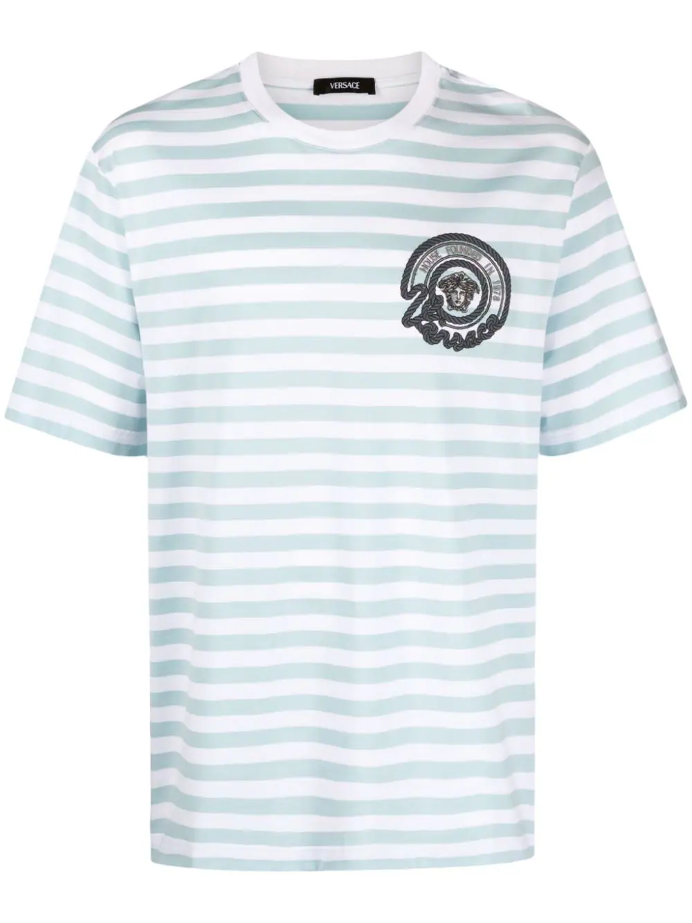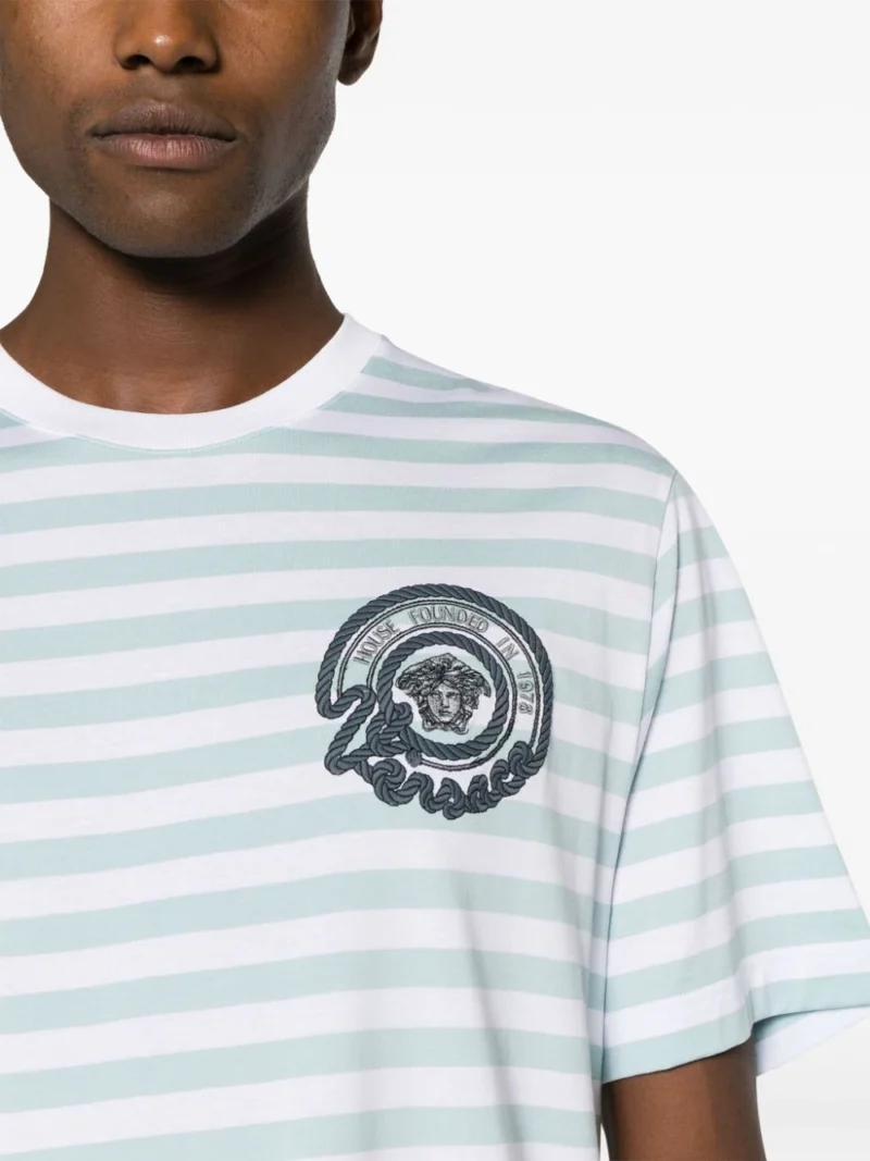 Tricou multicolor din bumbac, cu guler rotund, maneci scurte, logo Versace Medusa brodat la piept, imprimeu cu dungi orizontale si tiv drept. Potrivit pentru sezonul primavara/vara. 100% bumbac; 56% viscoza; 44% poliester; 100% bumbac.