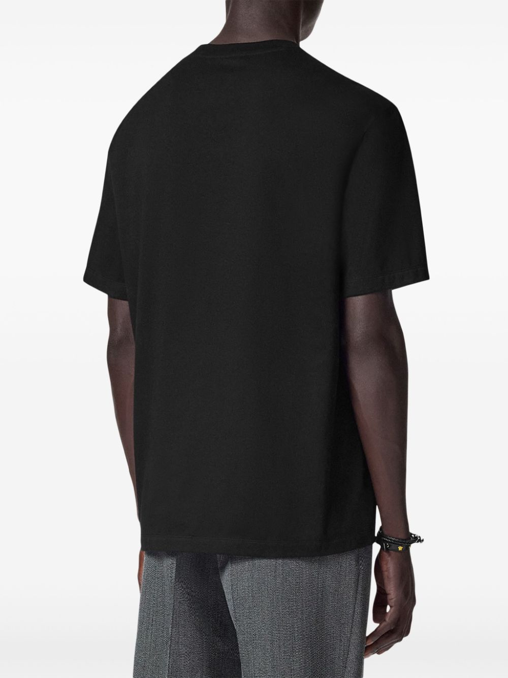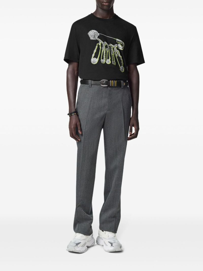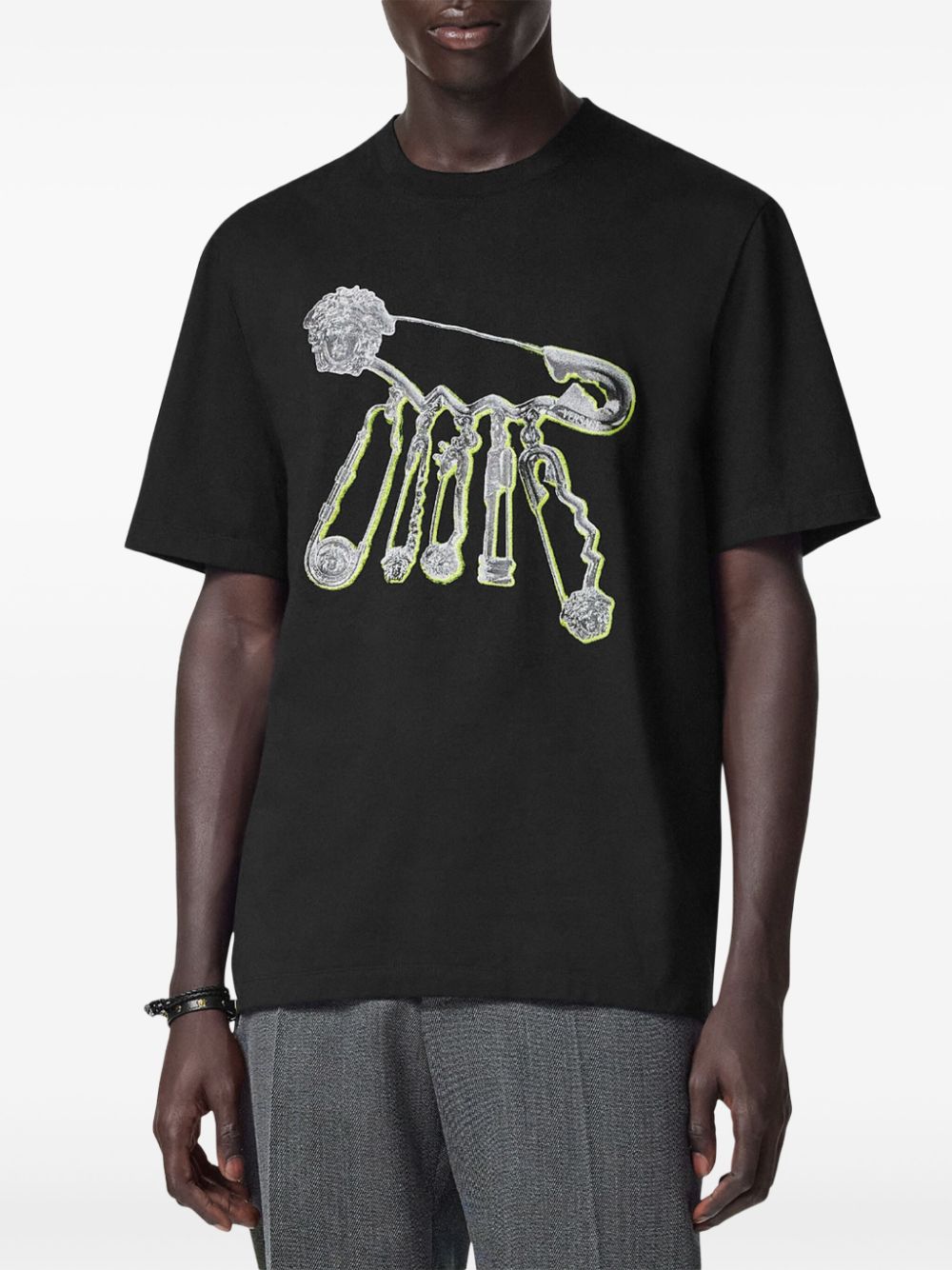 Tricou Versace Safety Pin negru, din textil, cu guler crew neck, umeri cazuti, maneci medii, grafica Versace „Safety pin” imprimata pe partea din fata si tiv drept. Potrivit pentru sezonul primavara/vara. 100% textil.