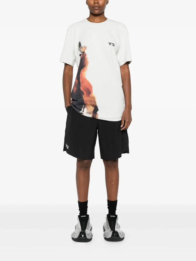 Tricou Y-3 abstract-print alb din bumbac, maneci scurte, guler rotund, imprimeu pe partea din fata, logo piept si tiv drept. 100% bumbac.
