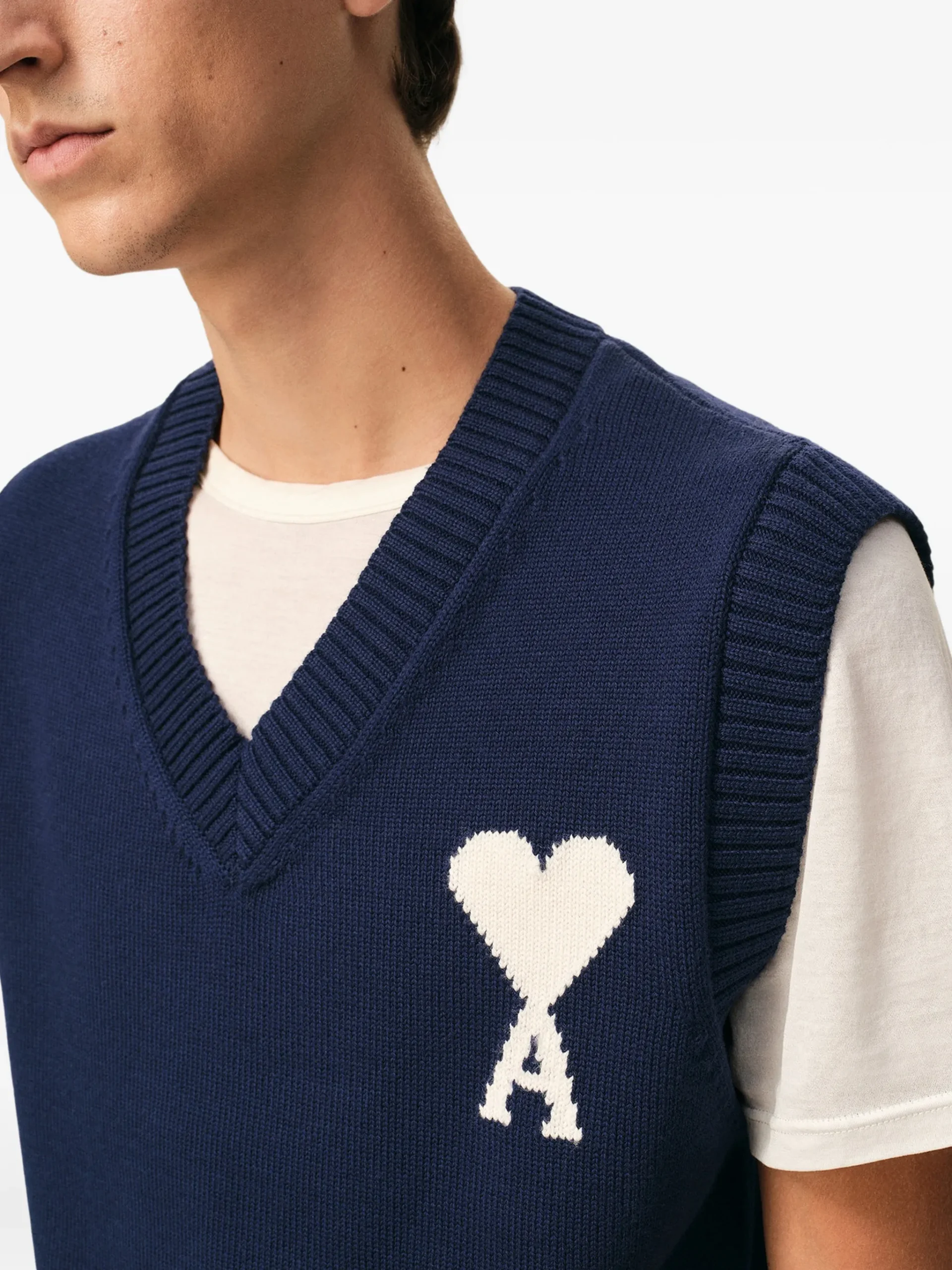 Vesta AMI Paris knitted albastra, tricotata, cu decolteu in V si tiv cu nervuri. 53% lana 47% bumbac