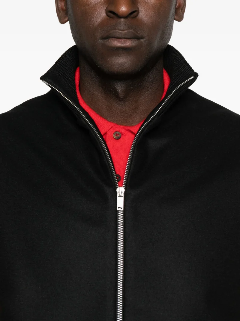 Vesta Jil Sander high-neck zip-front negru din lana premium, inchidere fermoar, fara maneci, guler clasic. 100% lana