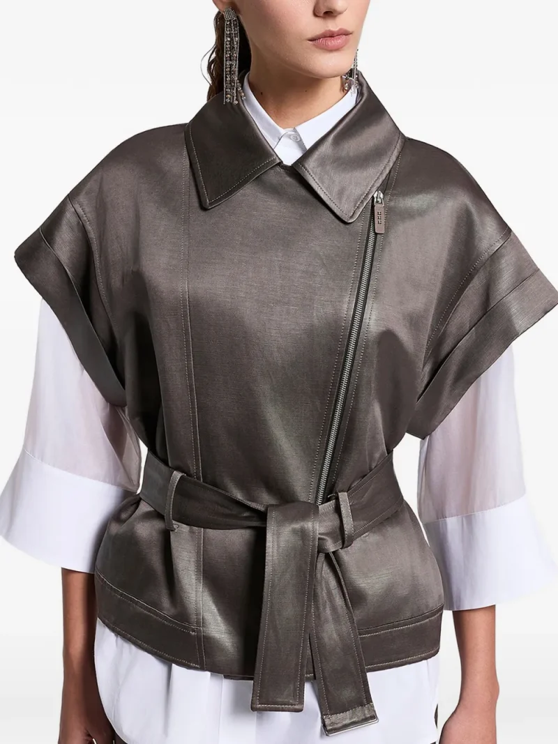 Vesta Peserico Belted Zip-Up maro, realizata din mix de materiale, cu guler clasic, inchidere cu fermoar lateral, umeri cazuti, aspect satinat si curea textila in jurul taliei. Potrivita pentru sezonul primavara/vara. 55% in; 45% acetat.