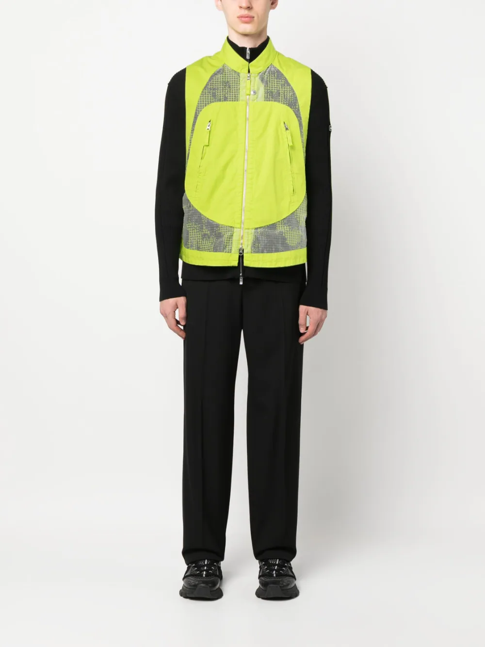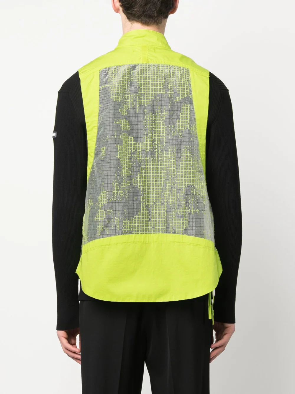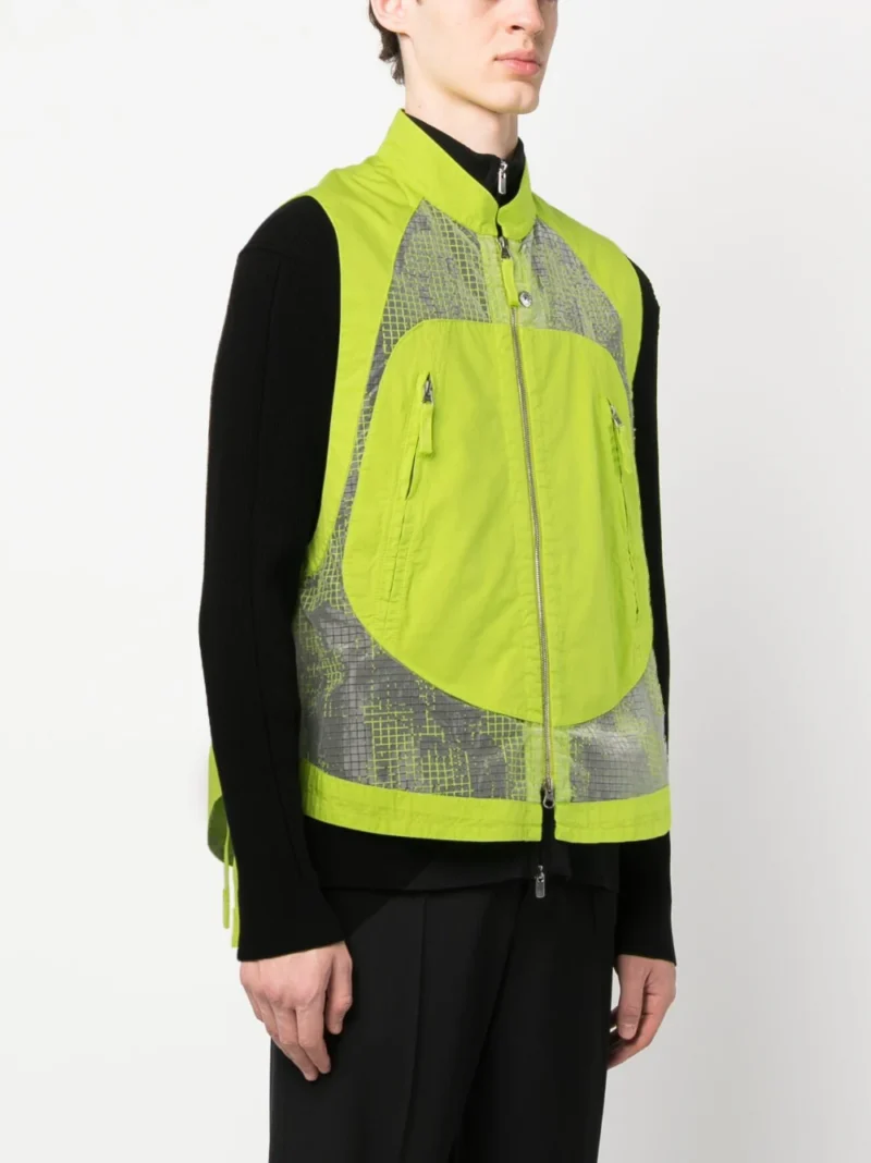 Vesta verde neon din Ripstop Organza-TC, cu guler inalt si inchidere cu fermoar, eticheta iconica Stone Island Shadow Project prinsa in doi nasturi pe lateral, buzunare laterale cu fermoar, design din panouri cu aparente diferite, tesatura semi-transparenta, talie ajustabila cu snur si tiv asimetric. Potrivita pentru sezonul primavara/vara. Detalii: Garment Dyed; Distorted Ripstop Organza-TC. 51% bumbac; 49% poliester; 100% bumbac.